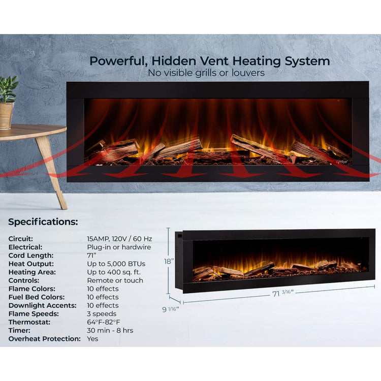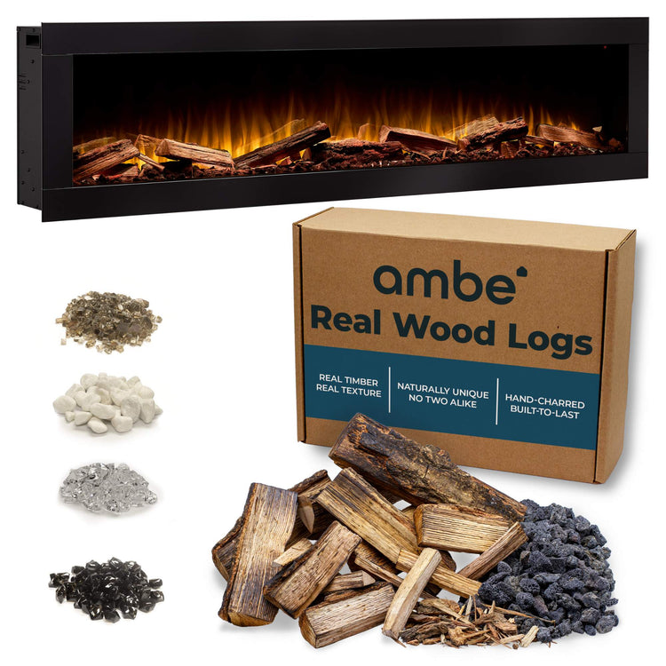 For those who crave authenticity in an ultrawide format, the Ambe Linear72 with real wood logs combines natural hardwood logs with black lava rock embers for striking realism. Each log is carefully cut and charred, creating a fuel bed that feels organic and alive.