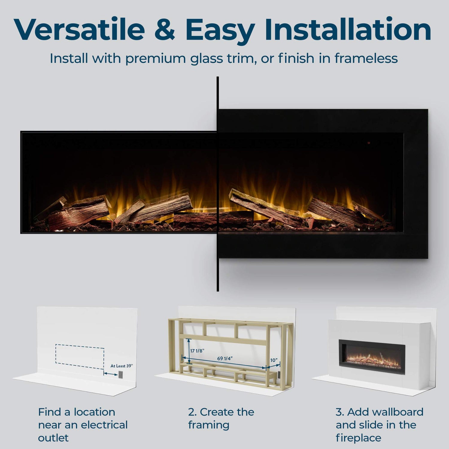Finish your install with whichever wall material you like, then plug the fireplace in and slide it into place. For more information on the install process, see our documentation.