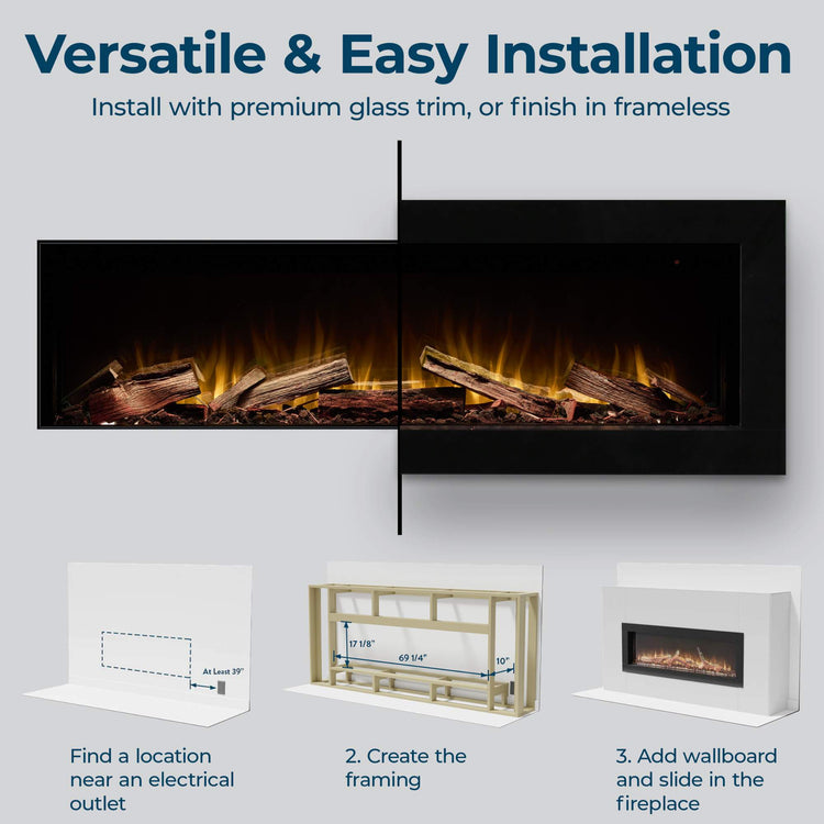 • Black Glass Fascia - This fireplace can be installed frameless for a clean minimalist look, but an optional black glass fascia is also included.