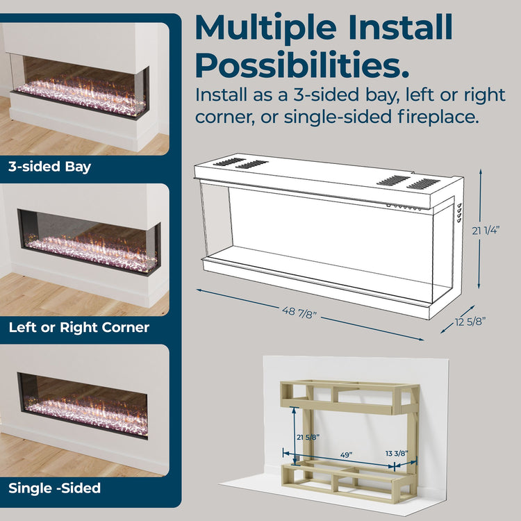 Construct the framing with an opening of 49”W x 21 5/8”H x 13 3/8”D, any construction material is suitable as the outside of the product does not get hot.
